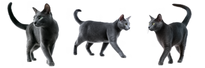 Three Russian Blue cats in different poses on black background isolated on a transparent background animal