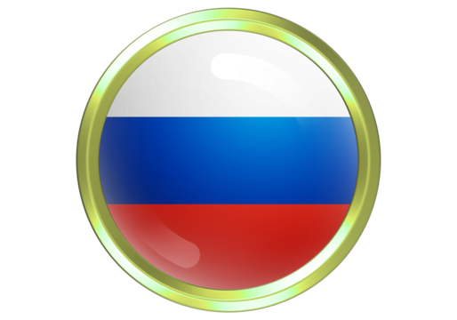 Glossy 3D Russian Flag Circle Button Icon with Gold Border on White Background