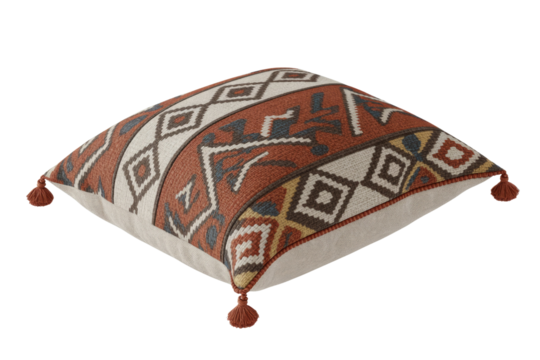 Stylish square throw pillow with a vibrant ethnic geometric pattern in rust, beige, and grey, featuring charming corner tassels. background removed