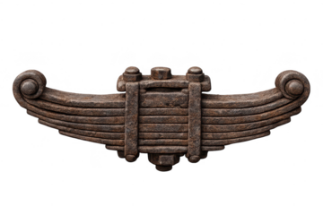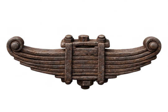 A rusty, old train car with rusted metal and a red color scheme, isolated on a white background.