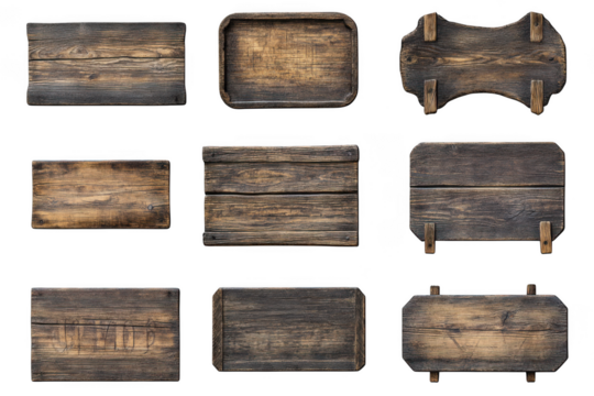 Collection of rustic wooden sign boards, vintage wood planks, textures, and elements for graphic design and crafts isolated on transparent background