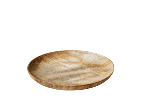 A smooth, light beige wooden plate, circular and shallow, sits against a black background