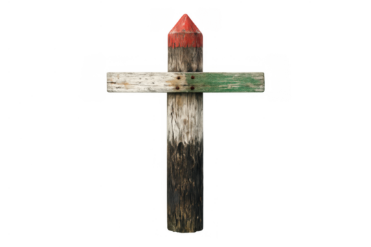 Weathered wooden post with red pointed tip and green paint, a rustic marker for direction or boundary, transparent background