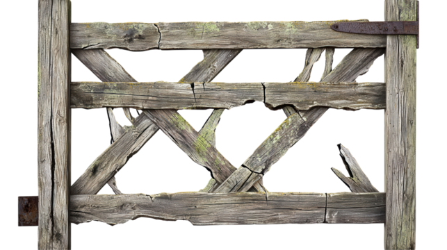 A rustic wooden gate with a weathered texture, featuring a diagonal pattern that suggests age and a connection to the outdoors.