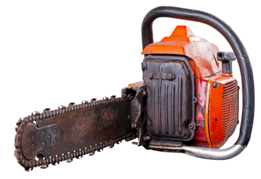 Old rusty chainsaw PNG isolated on transparent background, vintage power tool for cutting wood and forestry work
