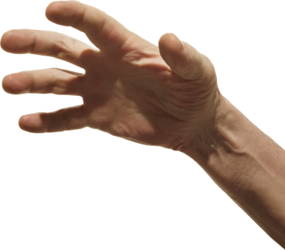 Open human hand reaching forward gesture on transparent background. Concept of user interaction, call to action, digital touch, interface engagement, trust signal.