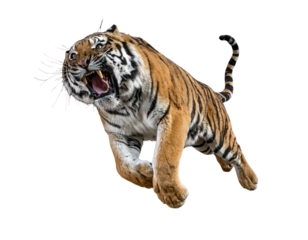A ferocious sabertoothed tiger with its mouth open, showing sharp teeth, isolated on a transparent background