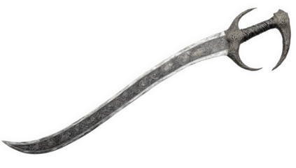 Ornate sword with curved blade and gold-detailed hilt, on black backdrop