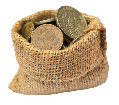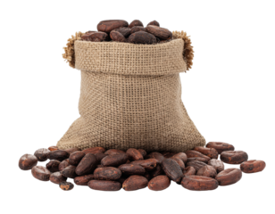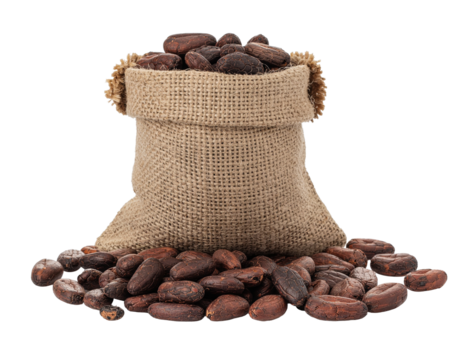 Brown whole grain rice in the jute canvas sack side view isolated transparent png. Uncooked,raw cereal.