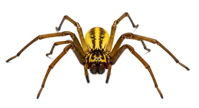 Yellow sac spider close-up featuring detailed markings isolated on a white background for scientific study or educational purposes