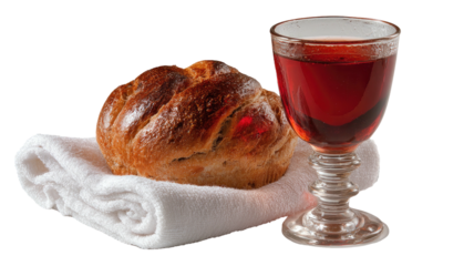 Wine-filled chalice and sweet bread atop white cloth against black background