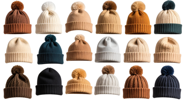 collection of knitted hats. each with a pom-pom on top. displayed in a grid format the hats vary in color. showcasing a range of earthy tones and vibrant shades. making them suitable for winter isola