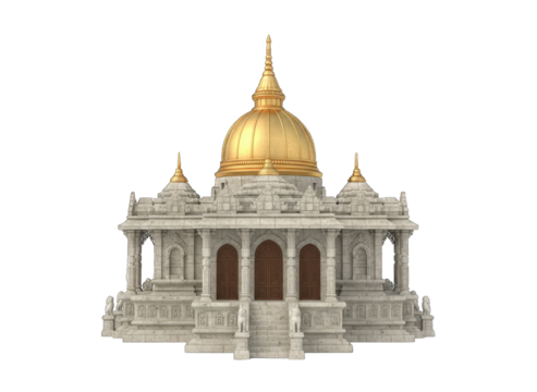 Ornate White Stone Temple With Golden Dome and Intricate Carvings Isolated on Black Background Full Shot