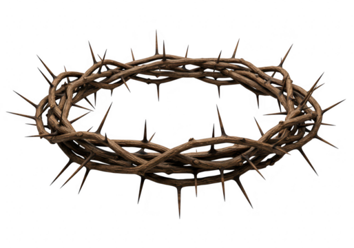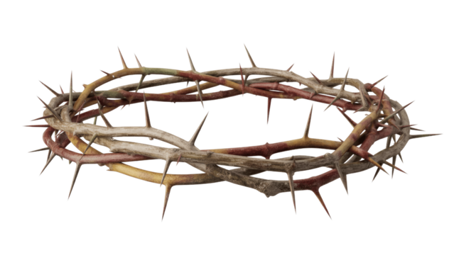 A detailed crown of thorns with sharp spikes intricately intertwined, symbolizing sacrifice and suffering, on transparent background.