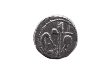 Silver Roman denarius coin replica of Roman emperor Julius Caesar celebrating his conquest of Gaul showing sacrificial implements, png stock photo file cut out and isolated on a transparent background