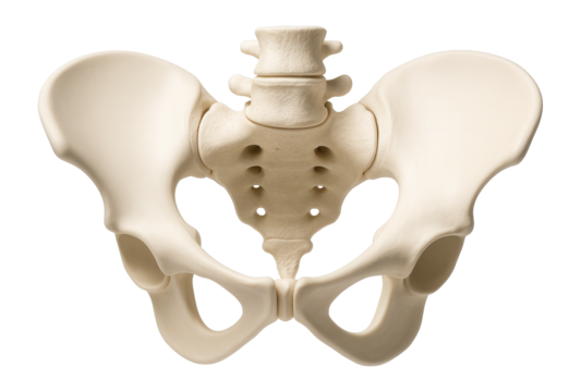 Human pelvic bone structure with sacrum and lower vertebrae on transparent background