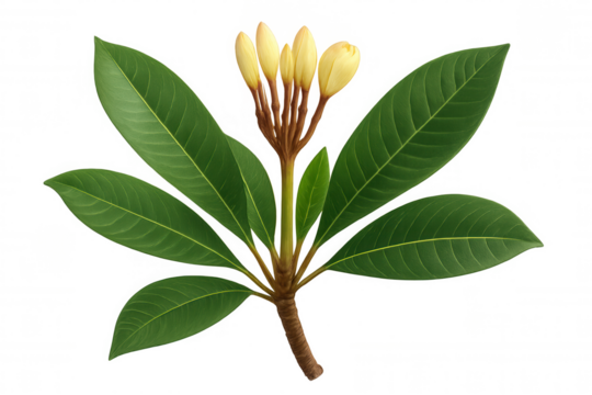 Plumeria branch showing green leaves, developing flower buds on tropical frangipani plant, transparent background