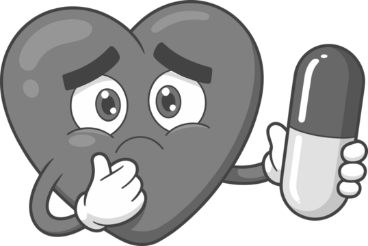 Worried heart character holding medicine capsule for health, healthcare awareness and medical treatment, promoting wellness and disease prevention