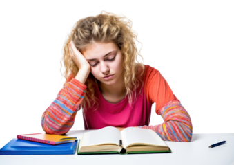 A student boy with a sad and frustrated expression struggles with learning disabilities, burnout, anxiety, and ADHD-induced stress while studying or preparing for tests isolated on a PNG background.