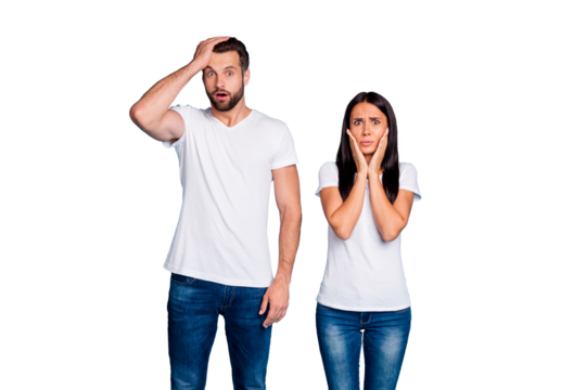 Photo of sorry pair made big mistake wear casual outfit isolated blue background
