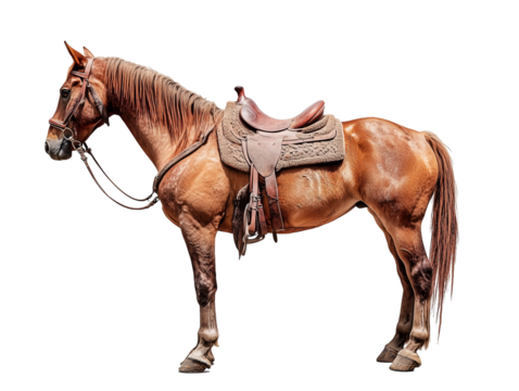 Brown horse standing still wearing saddle and bridle on transparent background