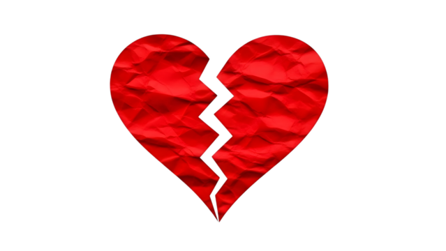 Red crumpled heart with a jagged crack in the middle symbolizing heartbreak or separation isolated on a transparent background