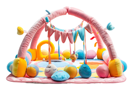 Colorful baby play mat with hanging toys and soft cushions, perfect for promoting sensory development and safe playtime.