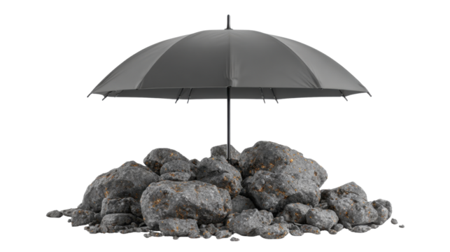 Umbrella covering rough rocks with golden specks, symbolizing shelter, insurance, and safeguarding assets, on transparent background