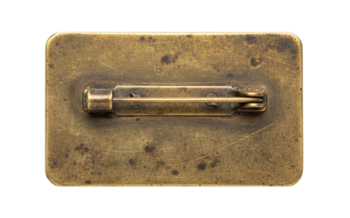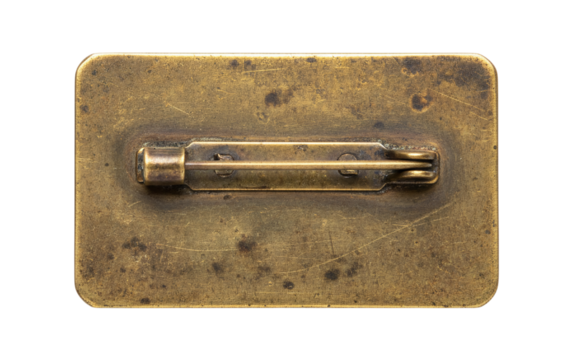 Back of an antique brass pin badge with safety clasp