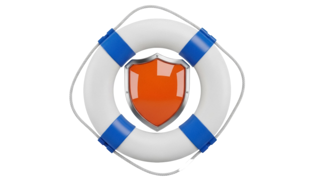 Orange shield inside lifebuoy PNG isolated on transparent background, safety and protection concept for security services and insurance
