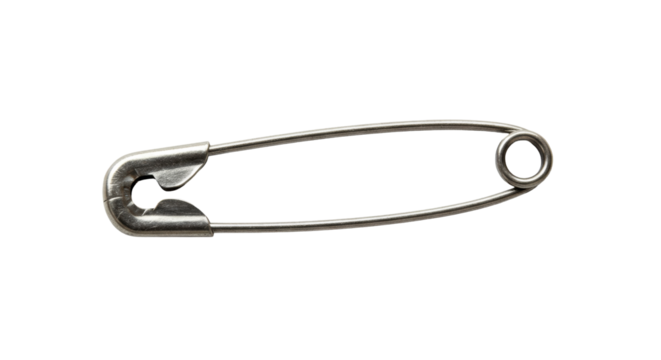 Silver metal safety pin for fastening, holding, and securing fabrics, isolated on transparent background