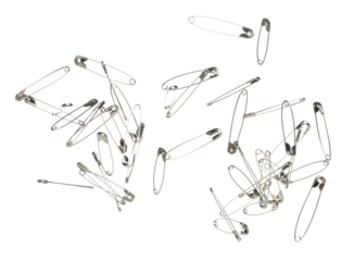 Safety Pin brooch pour fall down, explosion in air. Many safety pin medium size splash fly in group floating. White background isolated high speed shutter freeze motion