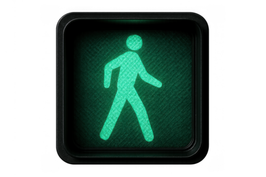 Green pedestrian traffic light sign indicating 'walk' on transparent background for road safety and urban navigation