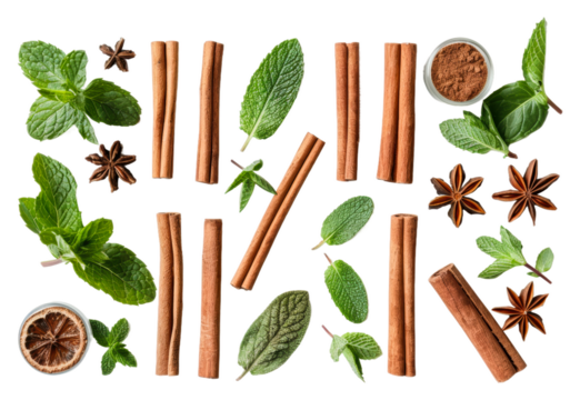 Cinnamon sticks and fresh herbs isolated on transparent background