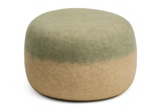 Round felt pouf with two-tone beige and sage green design on transparent background, reflecting modern interior decor