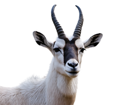 Elegant Addax Portrait, Majestic Spiral Horns and Striking White Coat in High Detail, Displaying the Beauty and Grace of This Endangered Antelope Species Up Close