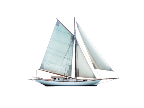 Isolated Yacht sailing boat, vintage style, with wooden hull and two white sails, afloat