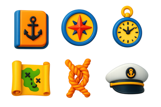 Sailor's Journey Icons. 3D icon set of sailor’s journey: ship logbook, compass rose, pocket watch, map scroll, rope knot,
