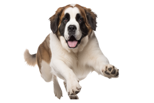 Impressive Saint Bernard standing against a white transparent backdrop.