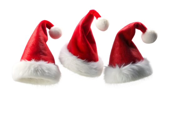 Three red santa hats with white fluffy trim and pompoms, arranged together and isolated on a transparent background