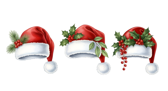 Three santa claus hats decorated with holly leaves and red berries