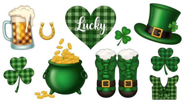 Happy st. Patrick's day text with green hat and shamrocks on transparent background