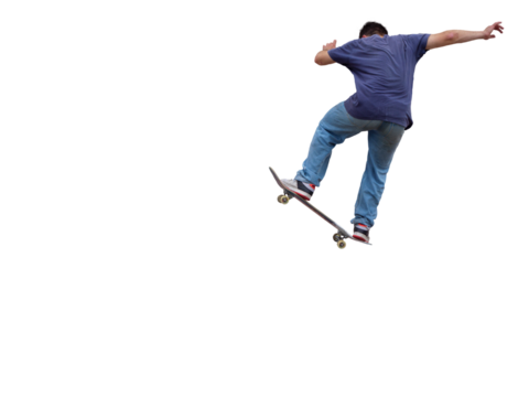 un skateur vu de dos en pleine acrobatie, tenue décontractée t-shirt et jean, action dynamique en extérieur, saison estivale