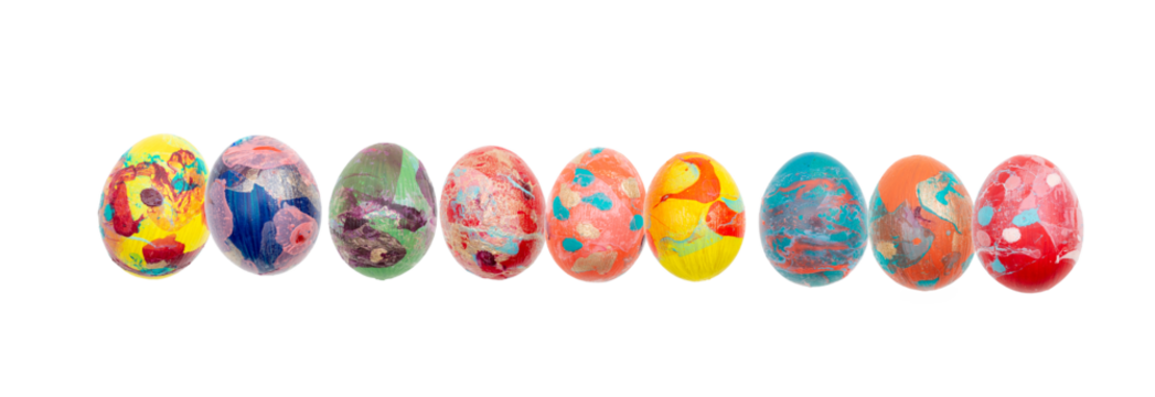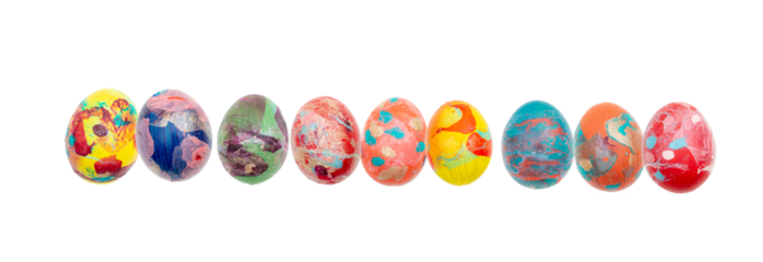 Composition de Pâques avec des œufs de poules colorés alignés sur un fond transparent. Concept de fêtes de Pâques.