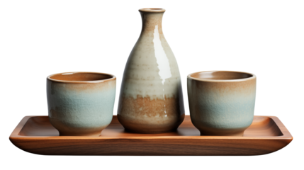 Traditional japanese sake set isolated on transparent background, featuring a ceramic bottle and two cups for enjoying the rice wine