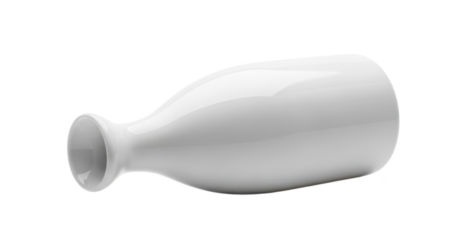 A simple white ceramic sake bottle lying on its side, isolated on a clean white background