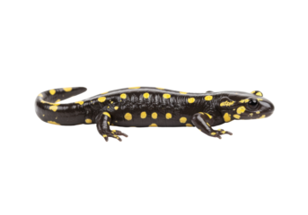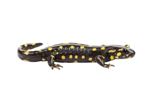 Isolated Spotted Salamander amphibian with yellow spots on black skin, amphibian macro shot