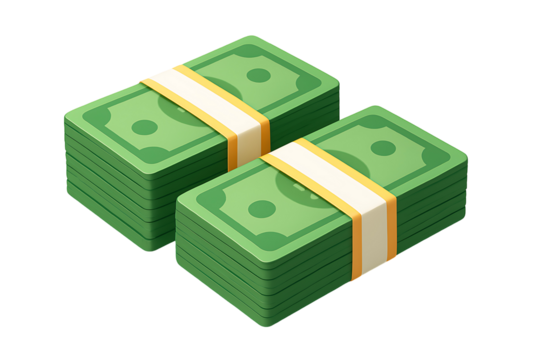 Two stacks of green paper dollar banknotes with yellow bands representing wealth and finance concepts 3d rendering illustration isolated on transparent background
