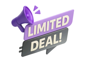 3d illustration of a purple megaphone announcing a limited deal with text on speech bubbles isolated on transparent background