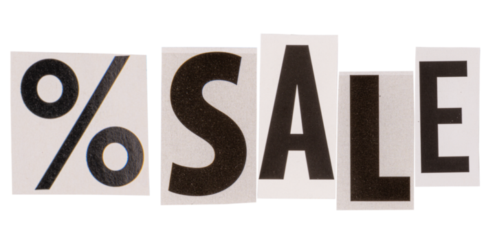 A black credit card with the word sale and a chip on it, presented against a white background, isolated cutout